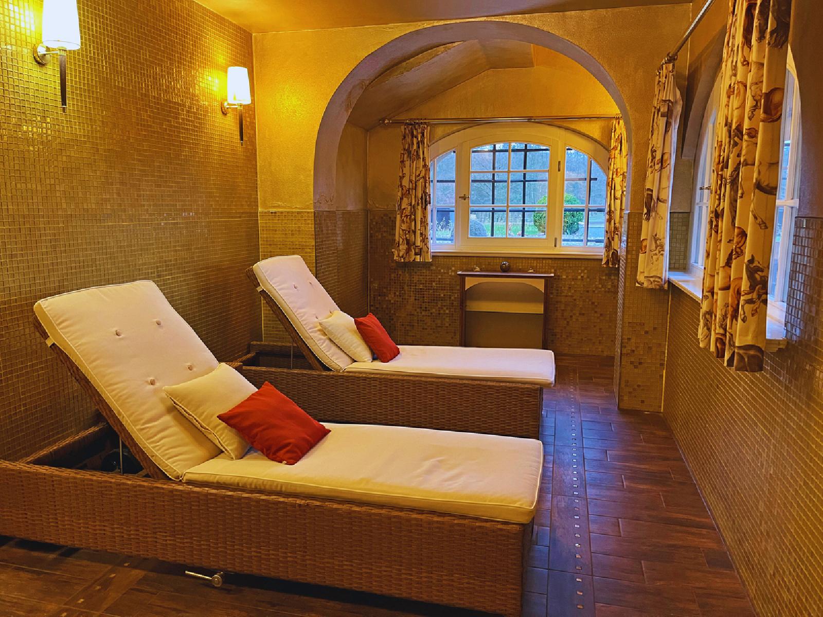 - Dagelijks gebruik van de wellnessruimte (in de historische gewelfde kelder van Hotel Bernsteinschloss) met de volgende faciliteiten (openingstijden volgens aankondiging ter plaatse):