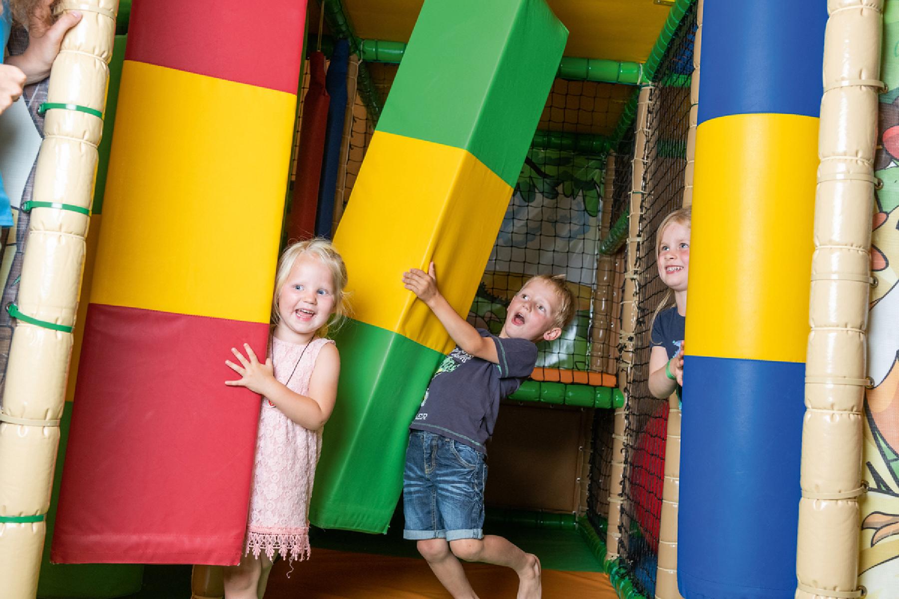 - Indoor speelruimte (ca. 300 m²) met Playsoft-installatie, glijbaan, klimwand, enz.